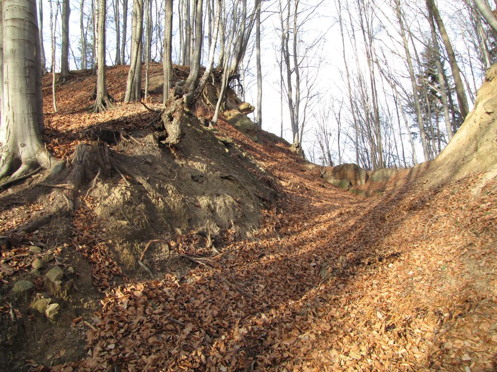 otoczona była suchą fosą i ziemnym wałem. Ślady po fosie widoczne są po dzień